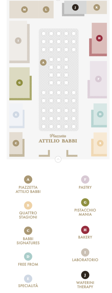 Tutt’attorno, le Botteghe delle Arti e dei Mestieri dove il pubblico troverà tante idee e ricette e potrà assaporare allo stesso tempo la tradizione e l’innovazione, i due pilastri della filosofia Babbi, nonché fare un salto nella storia dell’azienda dal 1952 a oggi. Ogni bottega sarà dedicata a un particolare settore: Gelateria, Pasticceria, Ho.Re.Ca., Specialità Dolciarie e ci sarà anche un’area esclusiva dedicata al Pistacchio Babbi, in cui sarà possibile vivere la nostra Pistacchio Mania.