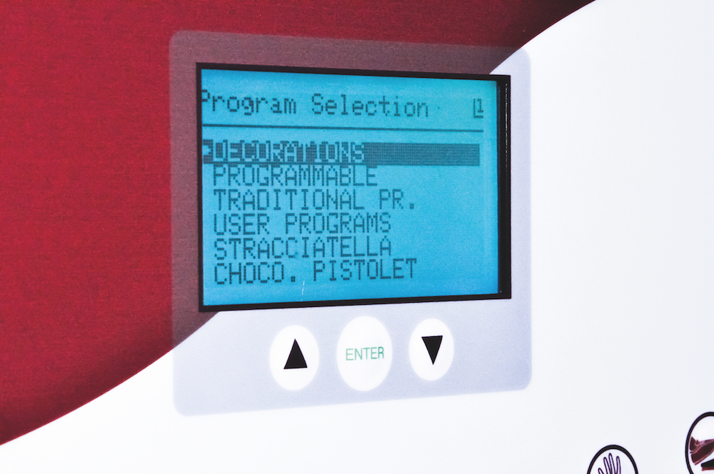 Questa nuova funzione permette di aumentare leggermente la temperatura del beccuccio per un breve tempo, dandoti la possibilità di correggere un’eventuale iper-cristallizzazione del cioccolato.