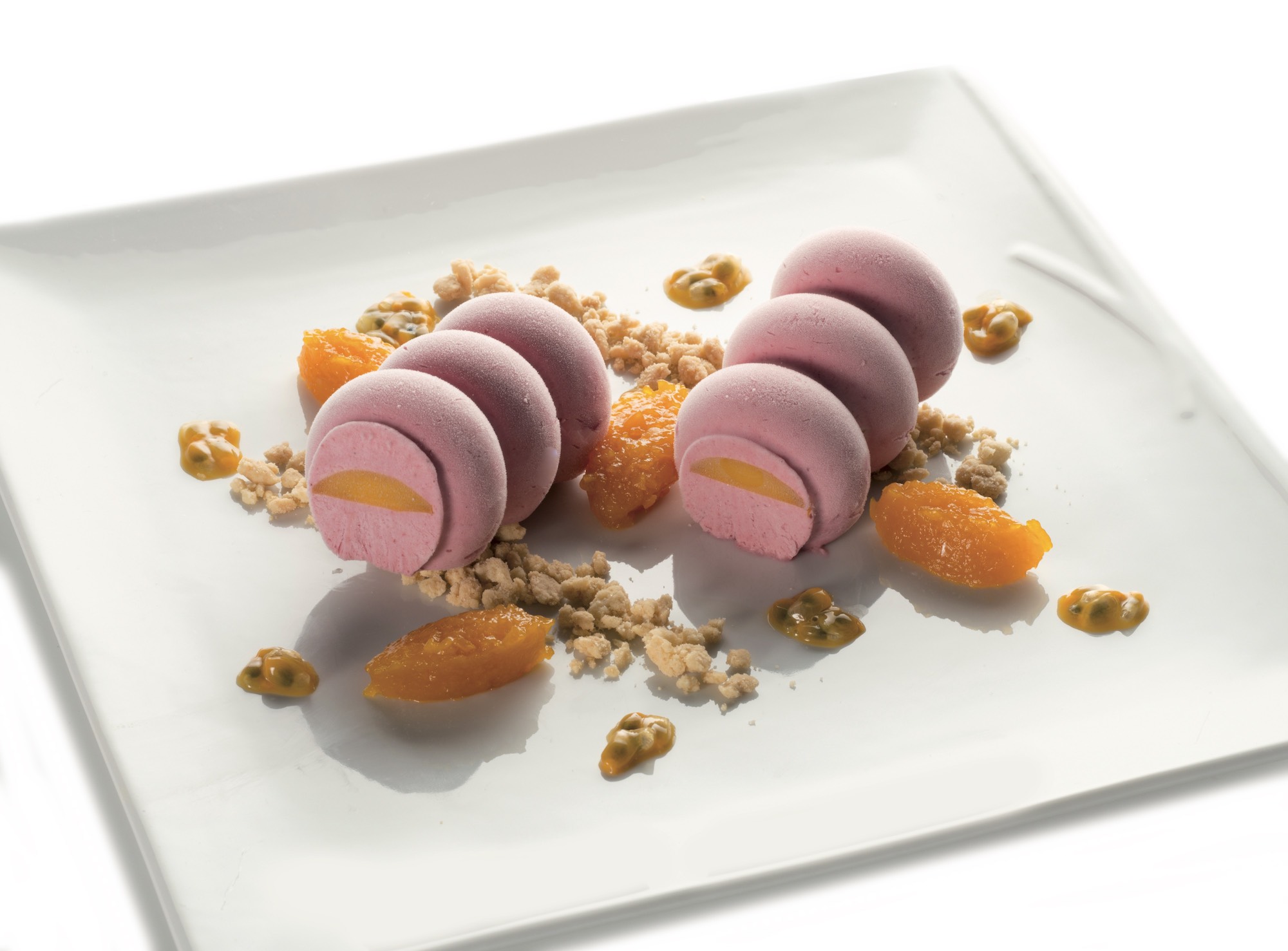 Semifreddo al lampone con inserimento di gelee al passion fruit, crumble di mandorle e quenelle di gelee al passion fruit. Semifreddo al Lampone Purea di Lampone gr. 300 Meringa italiana gr. 250 Panna fresca gr. 450 Totale gr. 1000 Procedimento: Montare in planetaria la panna, in una ciotola dosare la meringa e quindi aggiungere la […]