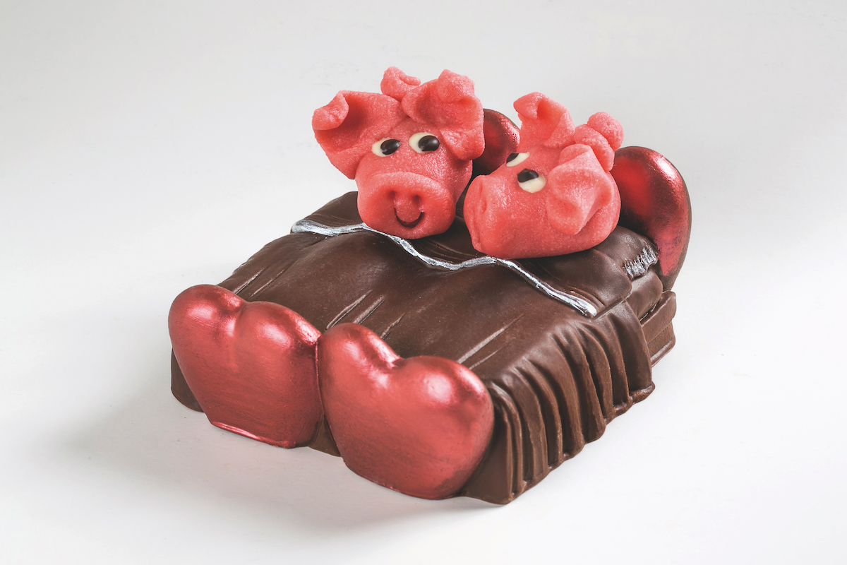 Pre cristallizzare una copertura di cioccolato a scelta e colarla nello stampo in silicone a forma di letto. Svuotare la copertura di cioccolato in eccesso. Lasciare cristallizzare in frigo. Estrarre delicatamente il letto dallo stampo in silicone. Colorare i cuori e dei dettagli del letto con dei coloranti alimentari in polvere metallizzati diluiti con un […]